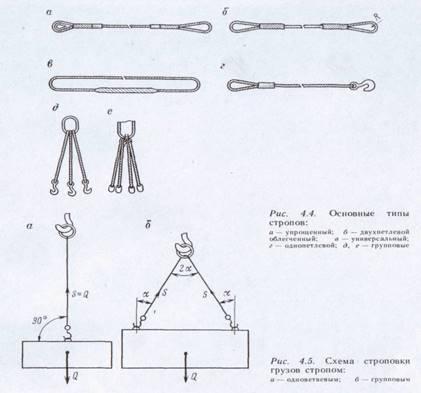 Для крепления груза, к крюку подъемного механизма применяют стропы. Основные конструкции стропов приведены на рис. 4.4. Диаметр каната строп определяется по условиям обеспечения прочности каната. Разрывное усилие каната Р должно превышать расчетное усилие в нем с учетом коэффициента запаса прочности К, устанавливаемого нормативными документами: P≥SK, где S — усилие (Н), зависящее от