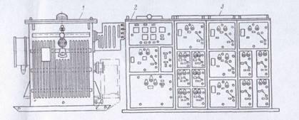При сооружении подстанций и распределительных устройств в последнее время широко применяют комплектные распределительные устройства (КРУ) на напряжение 6—35 кВ и комплектные трансформаторные подстанции (КТП) на напряжение 6—110 кВ. КРУ представляет собой отдельный шкаф, укомплектованный аппаратами первичных цепей, приборами и аппаратами защиты и заземления, учета и сигнализации, ошиновками и проводами вторичных цепей. Выключатели с приводами устанавливают стационарно или на выкатных тележках. КТП состоит из трансформатора (рис. 4.11), распределительного или вводного устройства высшего напряжения, комплектного РУ низшего напряжения 2, 3 с токопроводом между ними. КРУ и КТП изготовляют для внутренней или наружной установки. Применение КРУ и КТП позволяет повысить уровень индустриализации монтажных работ; уменьшить объем строительных работ; снизить трудозатраты при монтаже; повысить надежность и безопасность обслуживания; упростить комплектацию РУ.