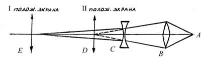 После этого рассеивающую линзу убирают, а экран перемещают к собирающей линзе и вновь получают четкое изображение предмета. Новое положение экрана определит координату точки D