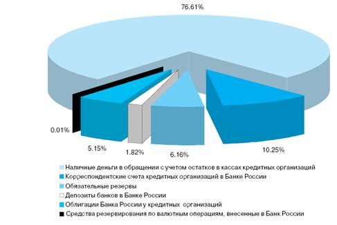 Итак, рассматривая рисунок 2.2. можно сказать, что наибольшую долю занимают наличные деньги в обращении с учетом остатков в кассах кредитных организаций - 76,61%, а самую наименьшую долю в структуре занимают средства резервирования по валютным операциям, внесенные Банком России – 0,01 %.