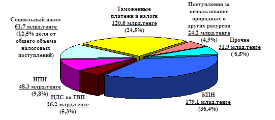 Структурный анализ, проведённый в дипломной работе, показал, что основными источниками налоговых поступлений республиканского бюджета являются корпоративный подоходный налог, налог на добавленную стоимость и поступления за использование природных и других ресурсов. Рост налоговых поступлений в республиканский бюджет растёт из года в год. Так с 2003 года налоговые поступления в республиканский бюджет увеличились более чем в 3 раза. Сумма налоговых поступлений в республиканский бюджет в 2008 г. на 36% превышают показатель 2006 года.