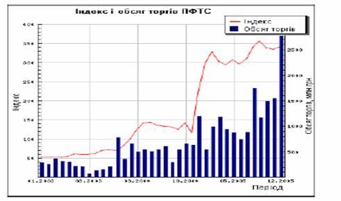У 2004 році ПФТС внесла зміни до свого Торгового Кодексу від 2002 року,яким регулюється поведінка торговців, допущених до користування її торговельноюсистемою.ПФТС продовжує оновлювати методику розрахунку Індексу ПФТС, що почаврозраховуватися у 1997 році, з метою задоволення змінюваних потреб ринку. Індекс ПФТС розраховується за принципом ринкового зважування, що використовує метод арифметичної середньої, і відображує динаміку курсів ліквідних акцій, що входять до складу індексу. Індекс розраховується щоденно на основі цін на час закриттяторгової сесії у гривнях. Значення індексу на певний день дорівнює загальній капіталізації індексу, поділеній на капіталізацію 1 жовтня 1997 року і помноженій на 100 (базове значення індексу). Склад індексу переглядається кожного місяця з метою представлення найбільш ліквідних акцій. Станом на 30 грудня 2005 року Індекс ПФТС містив 10 компаній, з яких “Укртелеком” і "Нижньодніпровський трубопрокатний завод" мали найвищий ваговий коефіцієнт 16, а “Укрнафта” була на третьому місці з ваговим коефіцієнтом 15%. Індекс ПФТС закрився на рівні 353 на дату 30 грудня2005 року, в останній торговий день року. Його найвищого рівня 365 було досягнуто увересні 2005 року, а його історичний мінімум 16,52 був зареєстрований у 1998 році.