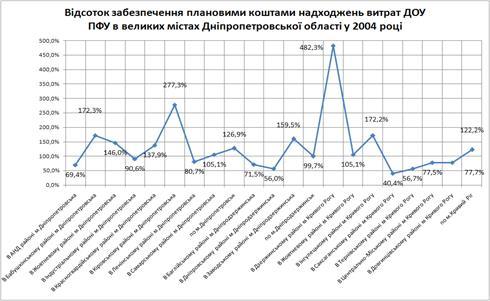Рис.Б.3. Порівняльна таблиця забезпеченості коштами в Пенсійному Фонді України у Дніпропетровській області у 2004 році (великі міста області –порайонно)