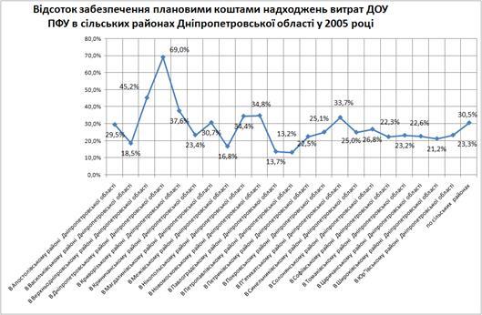 Рис.Б.8. Порівняльна таблиця забезпеченості коштами в Пенсійному Фонді України у Дніпропетровській області у 2005році (сільські райони області)