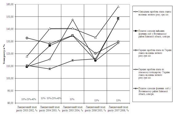 – ланцюгові темпи приросту обсягів податку з доходів фізичних осіб в бюджеті Яготинського району за 2006–2007 роки є вищими та становлять +15,87% у 2006 році відносно рівня 2005 року та +48,2% у 2007 році відносно рівня 2006 року;