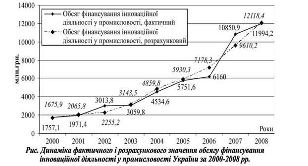 i розв'язавши його, отримаємо розрахункові значення результативної ознаки - обсягу фінансування інноваційної діяльності у промисловості України за досліджуваний період. Динаміку фактичного і розрахункового значення обсягу фінансування інноваційної діяльності у промисловості України за 2000-2008 рр. зображено на рисунку.
