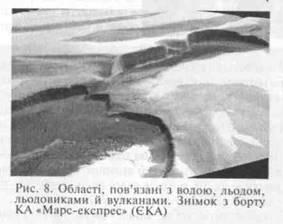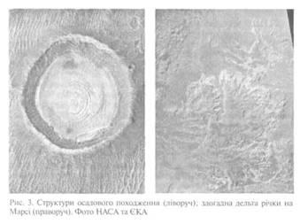 льоду. Це близько половини крижаногокупола Гренландії або 4% від запасів води в антарктичному льодовику. Атмосферні запаси води на Марсі дуже малі. У такій холодній атмосфері, як марсіанська, де вдень температура рідко досягає 300 К, а вночі стає нижчою за 170 К, утримати помітну кількість водяної пари неможливо. Якщо всю водяну пару, що міститься в марсіанському повітрі, сконденсувати, то вийде плівка завтовшки декілька десятків мікронів. Ще один-два мікрони сконденсованої води міститься в хмарах. Здавалося б, за таких умов навіть розмови про гідрологію утрачають сенс, але насправді так званий кругообіг води цілком можливий і в такій слабкій атмосфері, як марсіанська. Марс - це найближча до Землі за основними кліматичними параметрами планета Сонячної системи. Саме на цьому природному полігоні можна відпрацьовувати кліматичну систему, подібну до земної. Розібратися в деталях марсіанського клімату означає глибше зрозуміти земний клімат і цим самим ще на крок просунутися в спробі визначити неодмінні й достатні умови для розвитку біосфери. Питання проте, куди поділася марсіанська вода, виникало ще вдокосмічну епоху, коли потужність водозапасів північної полярної шапки оцінювали на основі наземних інфрачервоних спостережень. Адже якщо Марс формувався в умовах, близьких до умов формування інших планет земної групи, з одного й того ж газово-пилового диску, то і кількість летких речовин, утому числі води, на Марсі й інших планетах земної групи має бути приблизно однаковою. Більше того, Марс як планета, близька за розміщенням до планет-гігантів, мав би бути навіть дещо збагаченим леткими елементами проти Землі. Це пов'язано з тим, що зона початкового формування Землі була тепліша від марсіанської зони. Такі ж міркування приводять до висновку, що і та частина гідросфери, котра була привнесена під час ударів кометних тіл на стадії інтенсивного бомбардування, для Марса мала б бути принаймні такою ж потужною, як і для Землі. Відомі тепер механізми втрати летких речовин (такі, як вибуховий парниковий ефект, що, ймовірно, привів до практично повної втрати води Венерою) вимагають великих потоків сонячного випромінювання, а тому на Марсі не могли реалізуватися. Чому ж тоді немає марсіанських океанів? Ще більше запитань виникло після аналізу зображень марсіанської поверхні, здобутих КА «Марінер-9», «Вікінг-1» і «Вікінг-2» в 1970-х pp. Рельєф планети виявився помереженим каньйонами, що схожі на висохлі русла річок, а в «гирлах»" великих рівнин були знайдені структури осадового походження, аналогічні шельфам та островам у дельтах річок (рис. 1).