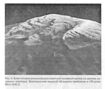 Наведені на рис. 5 зображення північної полярної шапки Марса вперше показують шари водяного льоду й пилу в перспективному уявленні. Тут можна виявити майже двокілометрові кручі, а також темнуватий матеріал у структурах, схожих на земні кальдери - казаноподібні западини з крутими схилами й рівним дном, що утворилися внаслідок провалу вершини вулкана, а іноді - і прилеглої до нього місцевості. Просторі області, покриті дюнами, можуть складатися з вулканічної золи. Поблизу марсіанського північного полюса «Марс-експрес» виявив цілі поля вулканічних конусів, причому деякі з них досягають висоти 600 м. Цілком імовірно, що їх можна вважати свідченням зовсім недавньої вулканічної діяльності на Марсі. Разом з тим питання про сучасну вулканічну діяльність на Червоній планеті все ще залишається відкритим.