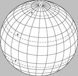 КАРТОГРАФИЧЕСКАЯ СЕТКА большинства карт и глобусов образована линиями долгот – меридианами, проходящими в направлении север – юг, и параллелями, обозначающими широты и следующими в направлении восток – запад. Часто показываются также Северный полярный круг (а), Северный тропик (б), Южный тропик (в) и Южный полярный круг (на рисунке не виден).