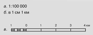 МАСШТАБ обычно представляется в виде дроби или отношения чисел (а), словесного выражения (б) или графически (в). Во всех трех случаях представлен один и тот же масштаб: 1 см на карте соответствует 1 км на местности.