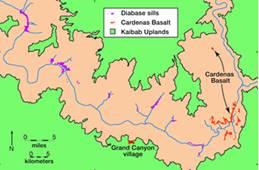: Карта Большого Каньона, на которой показано расположение выхода на поверхность лавовых пород слоя Карденас Базальт.