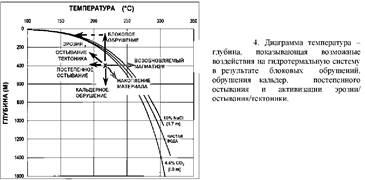 материала и образован большой амфитеатр с крутыми обратными стенками. Блоковое обрушение над гидротермальной системой внезапно уменьшает ограничительное давление в системе, которое может привести к гидротермальному брекчированию, кипению и рудообразованию. Эти эффекты аналогичны эффектам, обусловленным возобновляемым магматизмом, механизм этих процессов разный. Здесь происходит уменьшение ограничительного давления, а не увеличение температуры. Внезапное падение давления может произвести такой же эффект на гидротермальную систему, как и быстрое разогревание, что сопровождается резким снижением точки кипения гидротерм в системе при данных глубинных условиях. Однако в этом случае температура будет понижаться, а не повышаться, приводя к ретроградному наложению. Наоборот, обрушение кальдер, по-видимому, может привести к прогрессивному наложению.