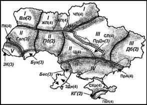 Світлим фоном виділені ядра регіонів, затемненим - їхні перехідні (периферійні) зони. Регіони першого рівня: І - "Північ" ("Полісся"), ІІ - "Західна Україна", ІІІ - "Східна Україна", IV - "Південь" ("Степ"). Регіони другого рівня: Вл(2) - "Волинь", Пд.(2) - "Поділля", Дб(2) - "Донбас",
