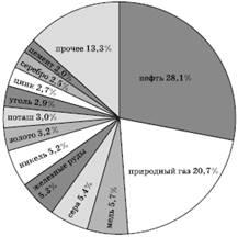 Данные таблицы 1 свидетельствуют о том, что в Канаде ведется крупная добыча и топливных, и рудных, и нерудных полезных ископаемых. При этом по стоимости продукции внеконкурентные первое и второе места занимают нефть и природный газ (рис. 1), хотя в мировой добыче место канадской нефти, как следует из той же таблицы, более скромное. В добыче рудных ископаемых складывается картина, можно сказать, обратная. Доля их в структуре канадской горнодобывающей промышленности сравнительно невелика, а в мировых показателях – очень значительна. Об этом свидетельствуют первое место Канады по производству урана, второе – по производству кобальта и никеля, третье – первичного алюминия. К этому перечню можно добавить также железную руду, медь, свинец, титан, вольфрам, золото, серебро, платину. Очень прочны позиции Канады и в добыче некоторых видов нерудного сырья (калийные соли, асбест, самородная сера).