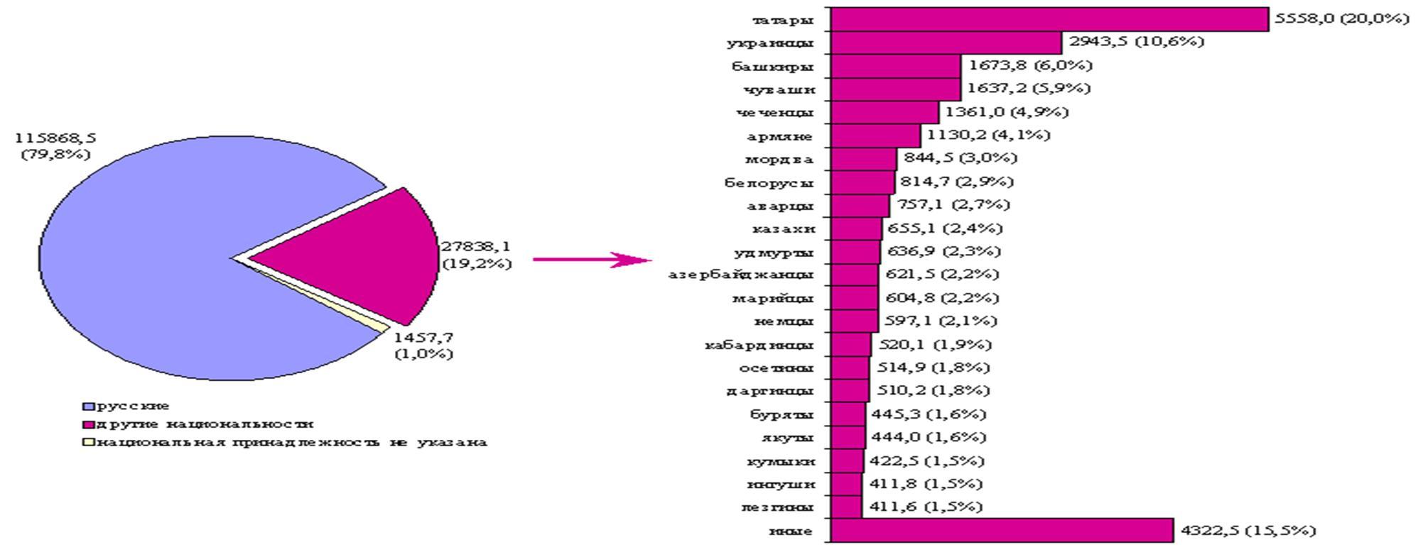 Большинство (1.900.000. В 1989 г. эти же народы - 350.000 человек) из них составляют татары (900.000. В 1989 г. - 157.376), евреи (500.000. В 1989 г. - 174.728), чеченцы (300.000. В 1989 г. - 2.101), башкиры (100.000. В 1989 г. - 5.417), дагестанцы (100.000. В 1989 г. - менее 10.000). Все остальные (чуваши, мордва, осетины, марийцы, коми и др.) - 400.000 чел.