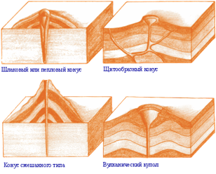 Шлаковый или пепловый конус, изображенный выше, образуется, когда при извержении вылетают в основном камни и пепел, но выделяется мало лавы. В Мексике очень известен вулкан Парикутин с характерным шлаковым конусом. В 1943 году этот вулкан появился на кукурузном поле. Через 6 дней он достиг высоты 150 метров! Затем он вырос до 400 метров в высоту и потух. При извержениях невзрывного типа с легко вытекающей лавой образуются щитовые конуса, показанные на схеме вверху. Вулканические острова Гавайи с их полого падающими склонами являются типичными щитовыми вулканами. Чередующиеся извержения с выбросом пыли, пепла и камней с последующим спокойным излиянием лавы создают конусы смешанного типа, как показано выше.
