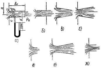 При заданном напоре Н за счет вакуума в зоне сжатия скорость истечения получается больше, чем при истечении из отверстия в тонкой стенке. Вместе с тем присоединение насадка к отверстию дает дополнительные потери по сравнению с истечением жидкости через отверстие без насадка, вызываемые внезапным расширением жидкости внутри насадка и трением потока о его внутреннюю поверхность. Обычно длина насадка Вентури LН = (3¸4)d. При меньших LН зона отрыва может стать незамкнутой (рис. 3ж) и истечение будет происходить как через малое отверстие в тонкой стенке.