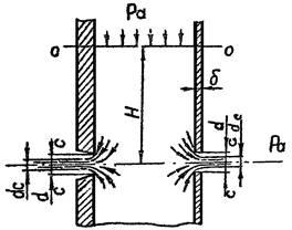 Стенка считается в гидравлическом смысле тонкой, если ее толщина δ ≤ (2¸2,5)d. В этом случае толщина стенки не влияет на истечение жидкости и в расчет принимается только местное сопротивление, возникающее при сжатии струи. В частном случае края отверстия могут иметь заостренную форму (рис.1). Условия истечения жидкости в этих случаях будут совершенно одинаковыми: частицы жидкости приближаются к отверстию из всего прилежащего объема, двигаясь ускоренно по различным плавным траекториям. Струя отрывается от стенки у кромки отверстия и затем несколько сжимается. Узкое сечение С-С, в котором течение имеет параллельноструйный характер и кривизна тока незначительна, находится на расстоянии (0,5¸1)d от плоскости отверстия.