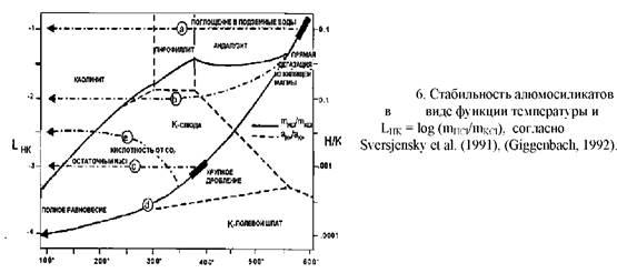 Эти системы также называются «адуляр-серицитовыми» системами (таблица 4.1), но это применимо лишь для узкого круга систем. В этих системах на больших глубинах, где реализуется порфировая рудная минерализация, источником гидротерм являются магматические дериваты (растворы) последней стадии плюс некоторое количество подземных вод. Giggenbach (1992) пришел к выводу, что системы такого типа образуются в тех случаях, когда интрузия находится на относительно большой глубине и/или в относительно непроницаемых вмещающих породах. Таким образом, магматические летучие подвергаются сильному охлаждению in-situ и взаимодействию вода-порода до того как они попадут в конвективный поток системы. Задержка летучих благоприятствует порфировому рудообразованию (рис..2), как, например, в случае месторождения Грасберг.