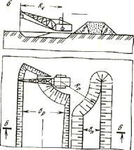 Рисунок 7.7 - технологические схемы бульдозерного отвалообразования при железнодорожном транспорте:а - торцовая; б - фронтальная; в - комбинированная