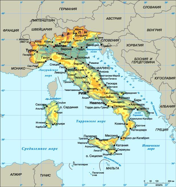 Итальянская Республика, государство в Южной Европе, имеющее выход к Средиземному морю. Занимает территорию, расположенную к югу от Альп, Апеннинский полуостров и два крупных острова в Средиземном море – Сардинию и Сицилию, а также множество более мелких островов. На суше Италия граничит с Францией на северо-западе, со Швейцарией и Австрией на севере и со Словенией на северо-востоке.