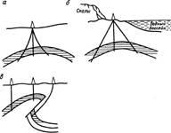 В проектах на бурение проводка скважин предусматривается вертикальной или в заданном направлении (наклонно-направленные). Направленное бурение проводят в тех случаях, когда кровлю пласта необходимо вскрыть в точках, проекция которых на земную поверхность смещена относительно устья скважины. Это требуется при кустовом бурении (рис.1,а) в случае, когда невозможно разместить оборудование непосредственно над объектом бурения (рис.1,б), при вскрытии крутопадающих пластов (рис.1,в) и т. п.