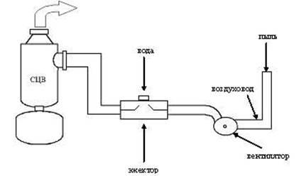 Первый вариант. Производится откачка шахтного газа из стволов шахты вентиляторными установками. Концентрация метана (горючих газов) в данном газовом потоке составляет 0,75%, что делает непригодным этот газ для дальнейшего использования в связи с тем, что в газовом потоке, откачиваемом из шахты идет большое количество угольной пыли, которая негативно влияет на работу вакуумного насоса. Данную пыль необходимо удалять. Сепаратор устанавливается перед вакуум-насосом для удаления мельчайших частиц пыли и влаги.