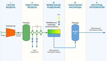В основе разделения газовых сред с помощью мембранных систем лежит разница в скоростях проникновения компонентов газовой смеси через вещество мембраны. Процесс разделения обусловлен разницей в парциальных давлениях на различных сторонах мембраны. Половолоконная мембрана состоит из пористого полимерного волокна с нанесенным на его внешнюю поверхность газоразделительным слоем[6].