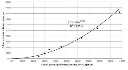 Рис.Т.2. - Регресійна нелінійна модель залежності сумарних обсягів депозитів фізичних осіб в банківській системі України від рівня середнього наявного доходу на 1 жителя України на рік