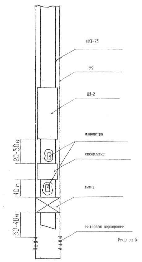 Для оценки продуктивных характеристик пласта одним из методов является применение пластоиспытателя. Пластоиспытание производится геофизической партией с участием бригады КРС, спускающей оборудование. После небольшой доработки предлагается спуск ДУ в компоновке с накером UNI-6 фирмы «Гапберсон» и спец.клапаном, позволяющий отработать в режиме пластоиспытателя. В результате возможен отказ от услуг геофизиков, исключая затраты на интерпретацию материала, (рис.5)