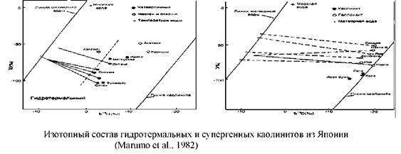 О в каолините, образованном из холодной грунтовой воды, будет значительно тяжелее, чем высокотемпературные каолиниты, т. к. при более низких температурах фактор фракционирования более эффективен. Таким образом, комбинацию изотопных данных по сере и кислороду, наряду с K-Ar данными можно однозначно использовать для идентификации типа систем __________________________ ___________________________