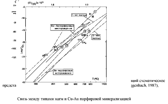 ; аналогичный вывод возможен для Чайканши, а также для некоторых жильных алунитовых месторождений шт. Юта. Предполагаемая связь этих месторождений с интрузиями также, связанными с медно-порфировыми месторождениями, была отмечена и обсуждалась рядом авторов. Однако, из групп медно-порфировьгх месторождений, в которых присутствуют высокие содержания золота, может иметь частичное отношение и связь с медно-порфировыми месторождениями, расположенными на более высоких гипсометрических уровнях золото-медных месторождений. В случае медно-порфирового месторождения Бутте " обрушение" метеорной конвективной ячейки на магматическую систему привели к концентрации первичной медной руды в жилах; это обрушение предварялось развитием продвинутой аргиллизации, связанной с кислыми магматическими флюидами. В связи с этим происхождение гидротерм высоко серной системы часто относится, по крайней мере, частично, к магматическому источнику.