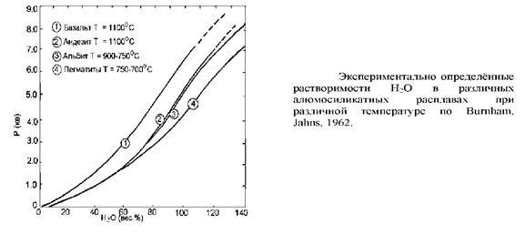 Растворимость как Н2О, так и СО2 находится в строгой зависимости от давления, но Н2О более растворимо в кислых расплавах, а СО2, H2S и SO2 в базальтовых расплавах. Зависимость растворимости Н2О от давления показана на рис. 2.6.