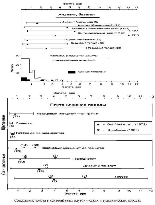 Рисунок 2.9 показывает, что в эпитермальной среде концентрации золота в обычных первичных породах не отличаются более чем на порядок. Следовательно, степень концентрации золота в исходных породах, необходимая для образования рудных месторождений, является контролирующим фактором в образовании экологически значимых месторождений.