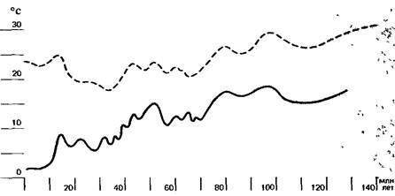 Рис.1. Палеотемпературы морской воды в тропической зоне за последние 140 млн. лет (по данным изотопного анализа).