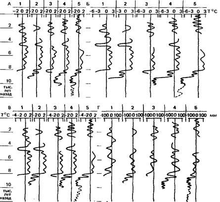 Во время теплого периода голоцена и его пика около 6 тыс. лет назад климат менялся в различных районах земного шара не одинаково. Как отмечает Флон (439), температура воды Куросио в этот период между Японией и Тайванем была почти на 6°С выше, чем теперь. В то же время на северо-востоке Северной Америки температуры были не так высоки. Некоторые районы Юго-Западной Сибири, Турции в это время были суше. Имеющиеся данные указывают, что подобного рода колебания температуры в 1-1,5°С в сочетании с колебаниями осадков существенно повлияли на развитие культуры целых народов (436).