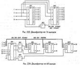 Микросхемы К176ИД1 и К561ИД1 (рис. 232) -дешифраторы на 10 выходов. Микросхемы имеют 4 входа для подачи кода 1-2-4-8. Выходной сигнал лог. 1 появляется на том выходе дешифратора, номер которого соответствует десятичному эквиваленту входного кода, на остальных выходах дешифратора при этом лог. 0. При подаче на входы кодов, соответствующих десятичным числам, превышающим 9, активизируются выходы 8 или 9 в зависимости от сигнала, поданного на вход 1 -при лог. 0 на этом входе лог. 1 появляется на выходе 8, при лог. 1 - на выходе 9. Микросхемы не имеют специального входа стробирования, однако для построения дешифраторов с числом выходов более 10 можно использовать для стробирования вход 8 микросхем, так как выходной сигнал может появиться на выходах 0-7 лишь при лог. 0 на входе 8 (рис. 233,234).