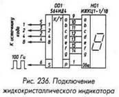 Подключение жидкокристаллического индикатора к микросхеме 564ИД4 проиллюстрировано на рис. 236. На вход S микросхемы подается меандр с частотой 30...200 Гц, этот сигнал проходит без инверсии на выход Р, увеличиваясь по амплитуде, как это описано выше для микросхемы 564УМ1. При подаче на входы 1-8 двоичного кода знака на выходах, соответствующихсегментам, которые надо индицировать, напряжение начинает меняться в противофазе с напряжением на выходе Р, и эти сегменты становятся темными. На тех же выходах, которые соответствуют неиндицируемым сегментам, напряжение меняется синфазно с напря-жением на выходе Р, и сегменты неотличимы от фона. При подаче на входы кодов чисел 0...9 на индикаторе формируется изображение соответствующих цифр, для кодов 10...13 индицируются буквы «L», «Н», «Р», «А», для кода 14 - знак «минус», при подаче кода 15 происходит гашение индикатора.