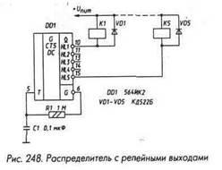 Большие выходные токи по выходам HL1 - HL5 позволяют использовать микросхему 564ИК2 в качестве распределителя с релейнымивыходами (рис. 248). Обмотки реле в этом устройстве должны быть рассчитаны на напряжение питания микросхемы и на рабочий ток, не превышающий указанный выше для выходов HL1 - HL5.