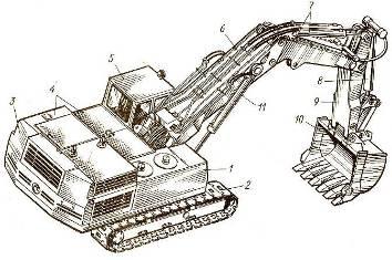 Экскаватор ЭО-5123 с оборудованием обратной лопаты: 1 – поворотная платформа с механизмами и рабочим оборудованием, 2 – гусеничная тележка, 3 – противовес, 4 – капоты, 5 – кабина, 6 – стрела, 7, 8, 11 – гидроцилиндры рукояти, ковша и стрелы, 9 – рукоять, 10 – ковш.