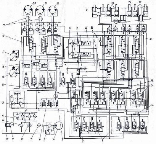 Гидросхема экскаватора: 1, 14 – блоки управления, 2, 16 – блоки клапанов, 3, 19 – центральный коллектор, 4 – ручной насос, 5, 12 – магистральные фильтры, 6 – гидроразмыкатели, 7 – магнитный фильтр, 8 – маслоохладитель, 9 – гидрозатвор, 10 – гидробак, 11 – предохранительный клапан, 13 – пневмогидроаккумулятор с блоком клапанов, 15, 17 – насосы силовой установки, 18, 25, 32 – гидрораспределители, 20 – 22 – гтдромоторы привода гусеничных лент механизма поворота, 23 – педальный блок управления, 24, 35 – клапаны «или», 26 – обратные клапаны, 27 – 30 – гидроцилиндры подъёма стрелы и поворота челюстей грейфера, ковша, рукояти, 31 – вращающееся соединение, 33, 34 – блоки золотников дискретного типа