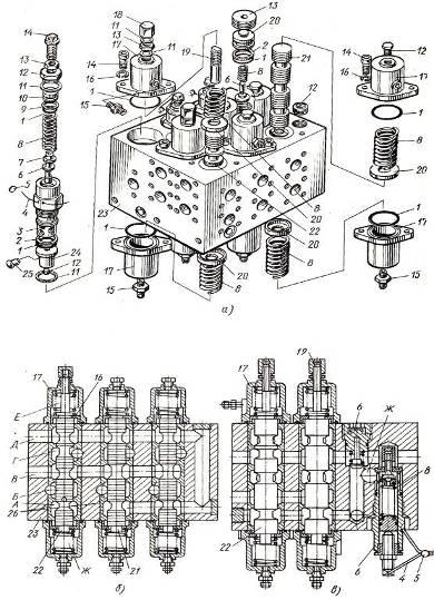 втулки, 21, 22 – золотники, 23 – корпус гидрораспределителя, 24 –