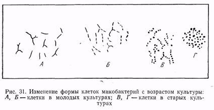 Для микобактерий характерно более или менее выраженное ветвление клеток. Оно обнаруживается в основном в молодых культурах и при развитии на определенных средах. У некоторых видов ветвящихся клеток очень немного. С возрастом клетки большинства видов распадаются на овальные образования. Расположение этих структур часто повторяет очертания ранее существовавших палочек. У некоторых видов такой распад наблюдается уже через несколько часов после пересева в свежую питательную среду. Эти микроорганизмы в последнее время относят к роду Arthrobacter. В старых культурах многие микобактерий образуют покоящиеся клетки – артроспоры, с утолщенной оболочкой и более плотной плазмой. Кокковидные и покоящиеся клетки при пересевах на новую среду прорастают в палочки. Обособление делящихся клеток микобактерий происходит по снэппинг-типу.