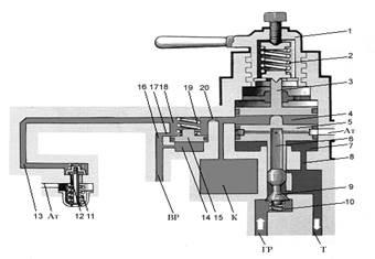 При торможении краном машиниста воздух поступает по каналу ВР от воздухораспределителя в полости 14, 18 и через калиброванное отверстие 20 диаметром 0,8 мм – в полость 4 и камеру К. Поршень 5 опускается, отжимает клапан 9 от седла и сообщает питательную магистраль ГР с тормозными цилиндрами Т до тех пор, пока давление в полостях 7 и 4 не сравняются.