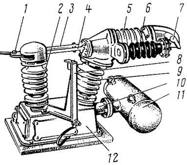 Основой выключателя ВОВ-25-4М является силуминовый корпус 12 (рис. 1), которым выключатель крепится к крыше электровоза. Уплотнение между корпусом и крышей обеспечивается резиновым шнуром. К корпусу с помощью патрубка прикреплен воздушный резервуар 11 емкостью 32 л. Во время процесса отключения сжатый воздух из резервуара подается в дугогасительную камеру через патрубок 10 и полость наклонного изолятора 9. Из резервуара выведена трубка, предназначенная для выпуска сжатого воздуха и конденсата. Трубка оканчивается в корпусе штуцером, к которому подсоединяется труба с запорным вентилем. Другой штуцер служит для подсоединения питающего воздухопровода.
