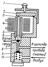 Привод состоит из цилиндра 3, в котором находятся отключающая пружина, шток, поршень и крышка электромагнитного вентиля 2. Поршень уплотнен резиновыми манжетами.