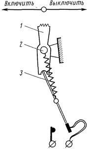 При повороте вала 61 в сторону, соответствующую включению выключателя, толкатель 37 перемещается влево, сжимает пружину 34, которая в свою очередь воздействует на якорь 33. Однако якорь электромагнитными силами удерживается в притянутом состоянии. В том случае, когда по каким-либо причинам по удерживающей катушке не протекает ток, под действием пружин якорь перемещается влево, и начинается отключение выключателя.
