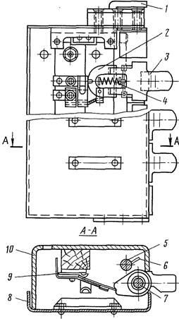 Между ножами разъединителя шарнирно укреплен вывод 1, предназначенный для присоединения выключателя к высоковольтной цепи. Вторым выводом выключателя является фланец 7, установленный на полом изоляторе 5. На корпусе закреплен кронштейн 8, на который заземляются ножи разъединителя в отключенном положении. Внутри корпуса смонтированы механизмы управления выключателем. Подвод низковольтных проводов управления и сигнализации к выключателю от цепей электровоза осуществляется через штепсельные разъемы.