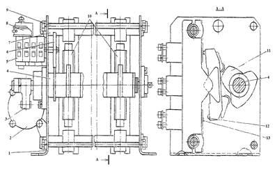 Все узлы и детали контактора собраны на изоляционном стержне 13 (рис. 1). В конструкцию аппарата входят подвижный 9 и неподвижный 10 контакты, дугогасительная камера 15, пневматический привод и блокировочные контакты. Неподвижный контакт представляет собой кронштейн 11 с дугогасительной катушкой 12 и собственно