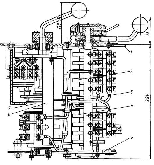 5 – промежуточные валы; 6 – синхронизирующая тяга; 7 – поднимающие пружины;